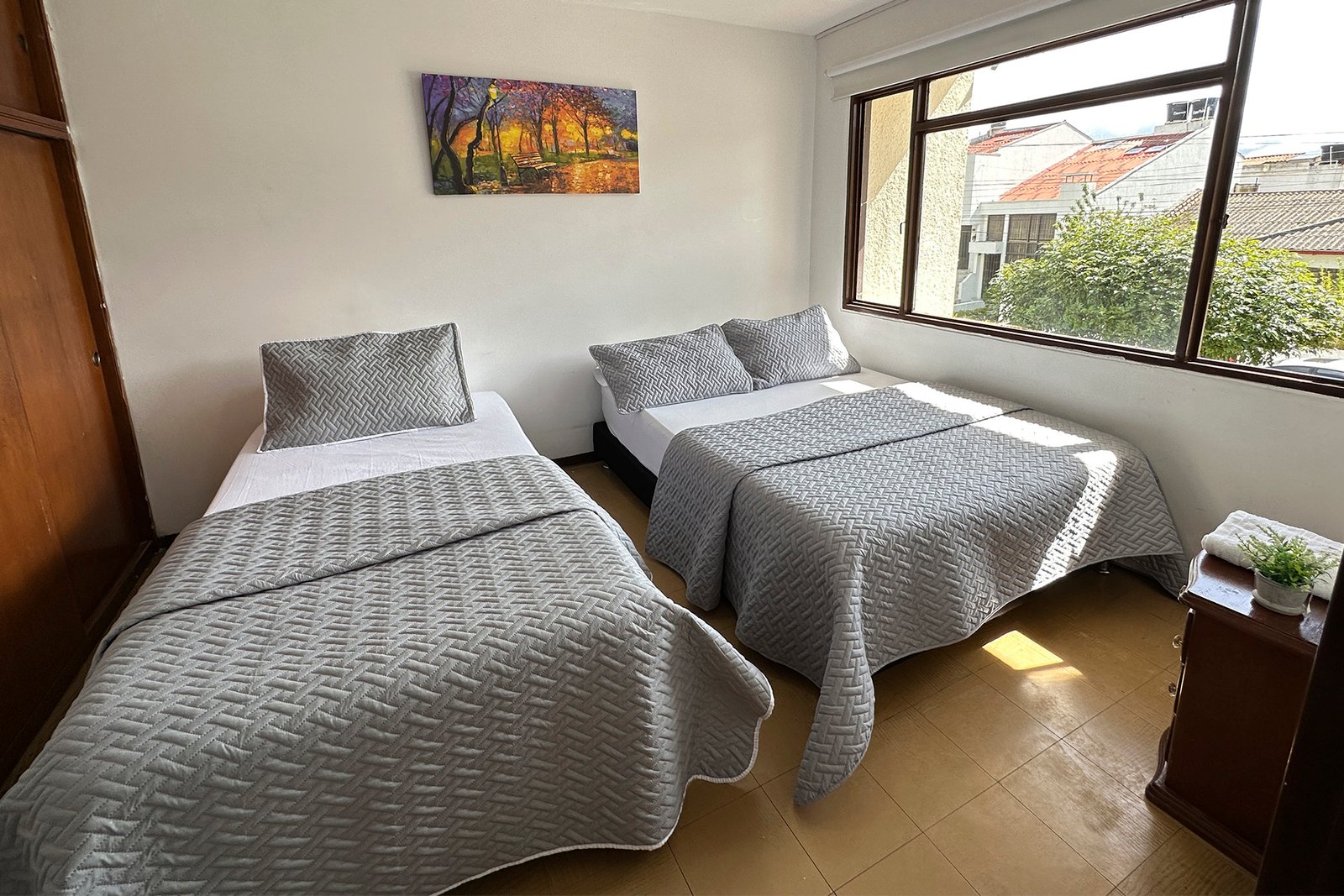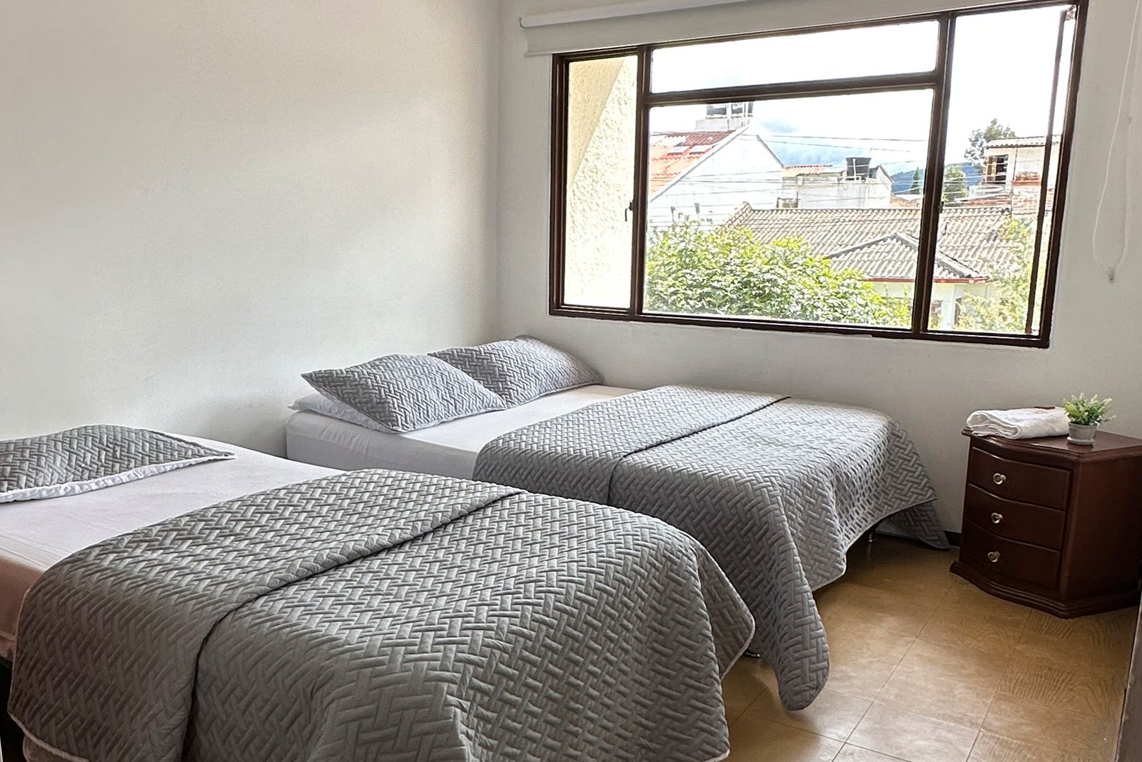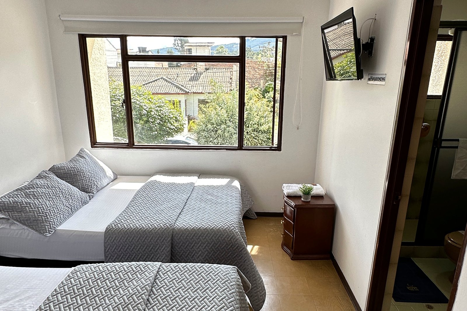 Habitación familiar, acomodación triple, cómoda, acogedora, baño privado, buena iluminación, ventilación, cálida y confortable. Vista exterior.